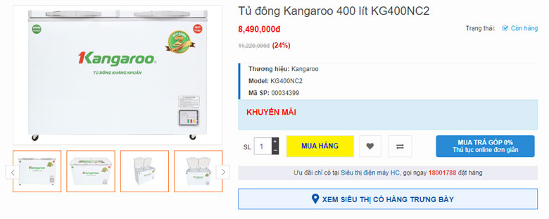Sản phẩm Tủ đông Kangaroo 400 lít KG400NC2 có giá là 8,490,000đ cập nhật mới nhất ngày 24/02/2023 tại Siêu thị Điện Máy HC với nhiều ưu đãi hấp dẫn. Để biết chính xác những thông tin ưu đãi này và mua hàng bạn có thể click: TẠI ĐÂY