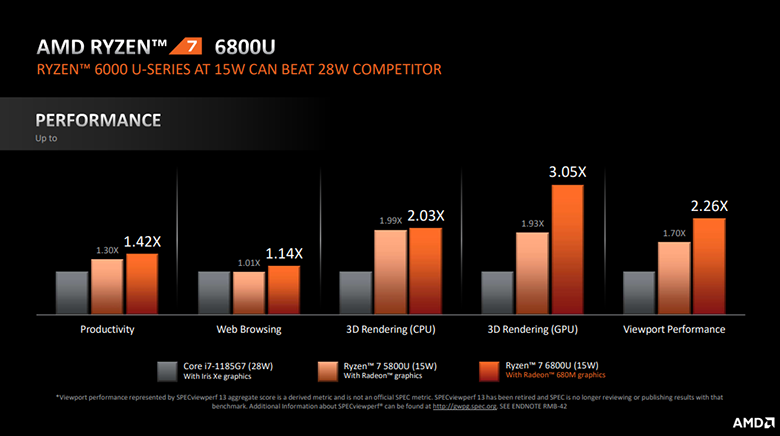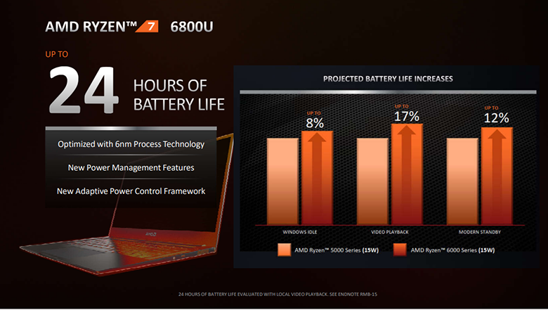 AMD Ryzen 6000 mobile series sử dụng kiến trúc CPU Zen 3+ mới nhất dựa trên tiến trình 6nm, kết hợp với bộ vi xử lý đồ họa sử dụng kiến trúc RDNA 2 vốn được sử dụng trên trong VGA đồ họa Radeon 6000 Series cao cấp của AMD cho hiệu năng xử lý vượt trội, nhanh hơn 30% so với sản phẩm cùng phân khúc cấu hình.