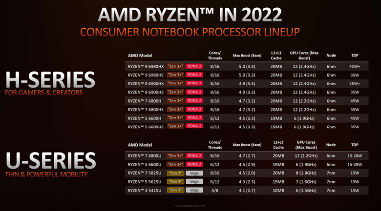 Vi xử lý cao cấp nhất trong AMD Ryzen 6000 series là dòng sản phẩm Ryzen 9 6980HX với 8 lõi xử lý hiệu suất cao, 16 luồng cho xung nhịp đến 5.0Ghz và 12 lõi GPU 2.4Ghz. Cả hai mẫu cao cấp nhất Ryzen 7 và Ryzen 9 đều tích hợp GPU 680M với 12 lõi GPU, thấp hơn một chút AMD Ryzen 5 sử dụng GPU 660M với 6 lõi GPU.