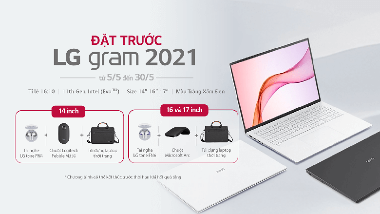 - Laptop 16” & 17”: bộ quà tặng trị giá 7.000.000 VND (Hộp quà bao gồm 01 chuột Microsoft Arc, 01 tai nghe không dây LG FN6, túi chống sốc cho laptop 16” và 17”)