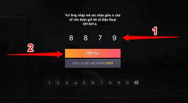 Bước 5: Bạn nhập 4 số trong tin nhắn gửi về vào (1) > Chọn "Tiếp tục" (2).