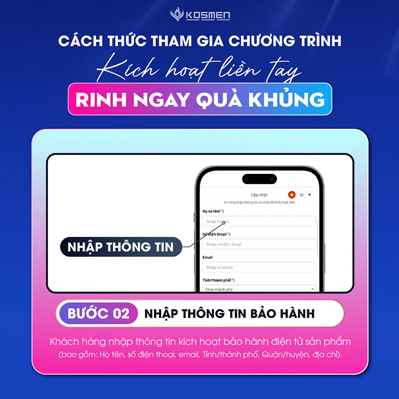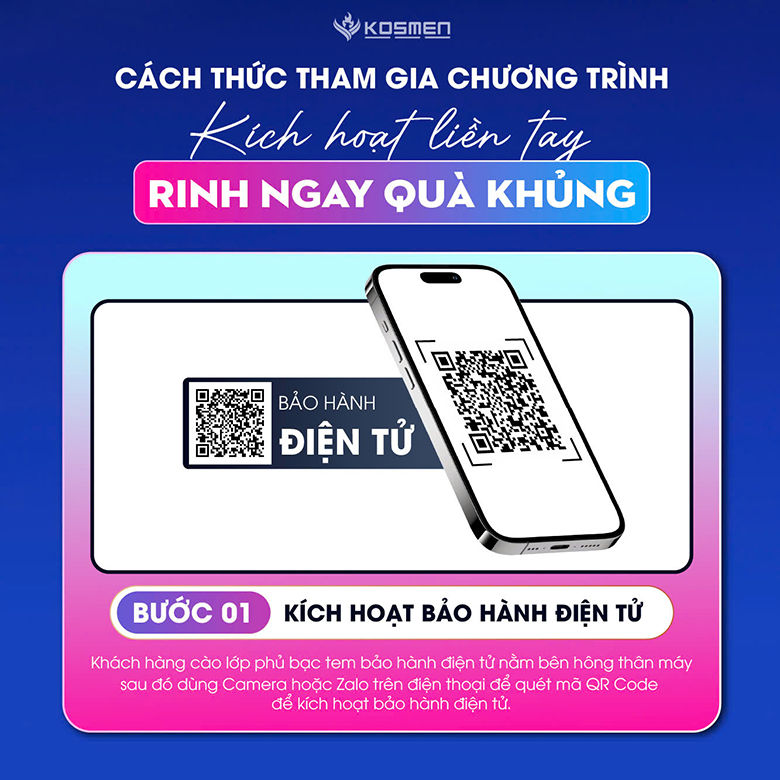 Lưu ý: Mỗi mã QR kích hoạt bảo hành chỉ được quét và tham gia một lần. Áp dụng cho sản phẩm thương hiệu Kosmen.