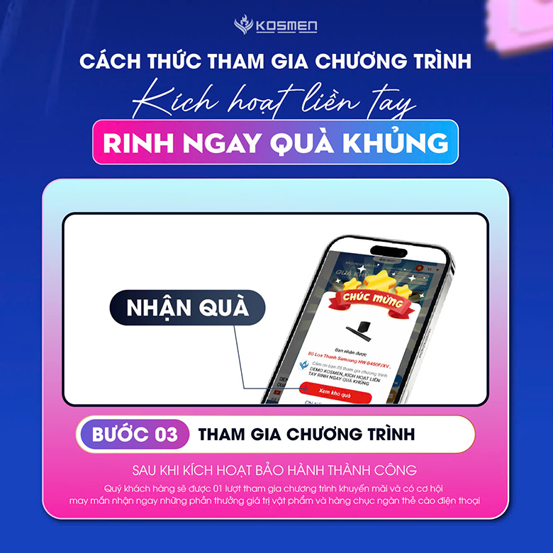 3. Nội dung chi tiết chương trình: Từ nay đến hết ngày 31/03/2026, khi mua sản phẩm Kosmen chính hãng tại Siêu thị Điện máy HC và kích hoạt bảo hành điện tử mở ra cơ hội nhận ngay nhiều phần quà giá trị hấp dẫn. (Trừ sản phẩm quạt điện thông minh Kosmen ECO-F40AI-W, Kosmen ECO-F40AI-B và quạt để bàn Kosmen F118).