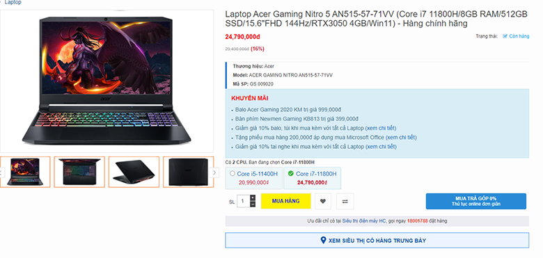Acer Nitro 5 AN515-57 là một trong những mẫu laptop gaming giá cả phải chăng nhất, cùng với đó là cấu hình build tổng thể khá ổn với mức giá. Máy trang bị card đồ họa Nvidia Geforce RTX 3050 hàng đầu kết hợp với CPU Intel Core i7 Gen 11 11800H cho trải nghiệm game eSport 1080p ở mức mượt mà nhất, bàn phím độ phản hồi tốt cho mang lại cảm giác thoải mái, cùng tản nhiệt mát mẻ và độ ồn thấp.