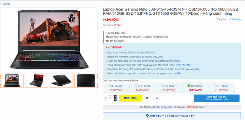 Acer Nitro 5 AN515-45 là một trong những mẫu laptop gaming giá rẻ, cùng với đó là cấu hình build tổng thể khá ổn với mức giá. Máy trang bị card đồ họa Nvidia Geforce GTX 1650 kết hợp với CPU AMD Ryzen 5 cho trải nghiệm game eSport 1080p ở mức mượt mà nhất, bàn phím độ phản hồi tốt cho mang lại cảm giác thoải mái, cùng tản nhiệt mát mẻ và độ ồn thấp. Điểm hạn chế thời lượng pin thấp chỉ 2-3 tiếng sử dụng liên tục và độ phủ màu bình thường, bù lại máy trang bị bàn phím RGB 4 Zone tùy chỉnh, ngoài ra nếu bạn chỉ quan tâm đến hiệu suất lõi thì Acer Nitro 5 AN515 sẽ là lựa chọn hàng đầu .