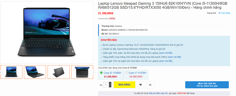 Lenovo Ideapad gaming 3 là mẫu laptop chơi gaming giá rẻ nhất của lenovo, máy trang bị card đồ họa RTX3050 hàng đầu hiện nay, kết hợp với CPU Intel Core i5 Gen 11 11300H cho khả năng xử lý mượt mà các tựa game online eSport hàng đầu hiện này, bàn phím phản hồi tốt cùng với thiết kế mỏng nhẹ là ưu điểm của mẫu laptop gaming 3 này. Điểm hạn chế là máy có số cổng kết nối hạn chế và độ phủ màu ở mức bình thường, bù lại máy có thiết kế khá gọn nhẹ.