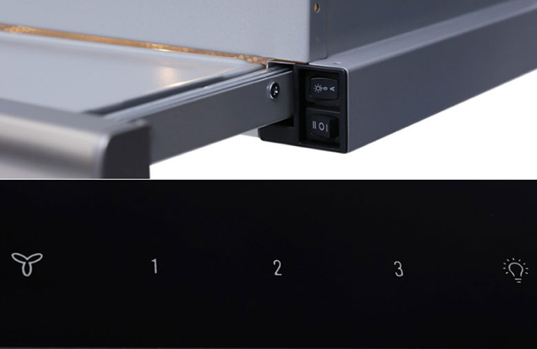 + Bảng điều khiển có thiết kế là nút bấm hoặc cảm ứng có chú thích rõ ràng giúp bạn dễ dàng bật/tắt máy hút mùi, bật/tắt đèn chiếu sáng, chỉnh tốc độ hút.