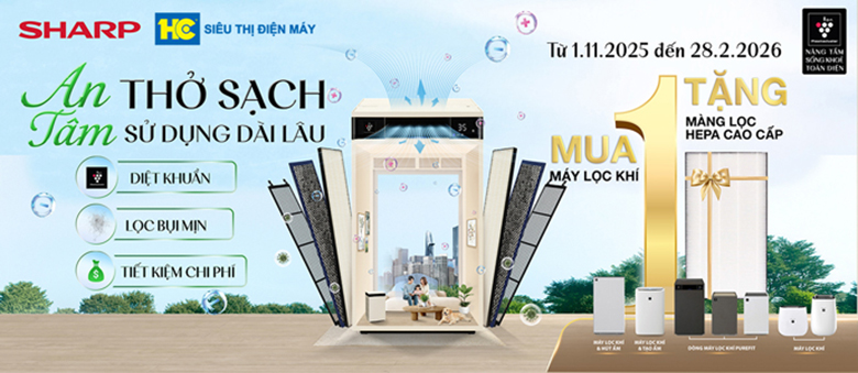 Nhằm tri ân khách hàng và mang đến trải nghiệm sống khỏe mỗi ngày, Sharp triển khai chương trình ưu đãi cực lớn dành cho các dòng máy lọc không khí chính hãng. Khi mua 01 máy lọc không khí, bạn sẽ nhận ngay một quà tặng giá trị đi kèm giúp cả gia đình an tâm hít thở sạch, tận hưởng bầu không khí tinh khiết và sử dụng thiết bị dài lâu, tiết kiệm chi phí. Xem ngay thể lệ chương trình chi tiết dưới đây để không bỏ lỡ ưu đãi hấp dẫn này nhé!