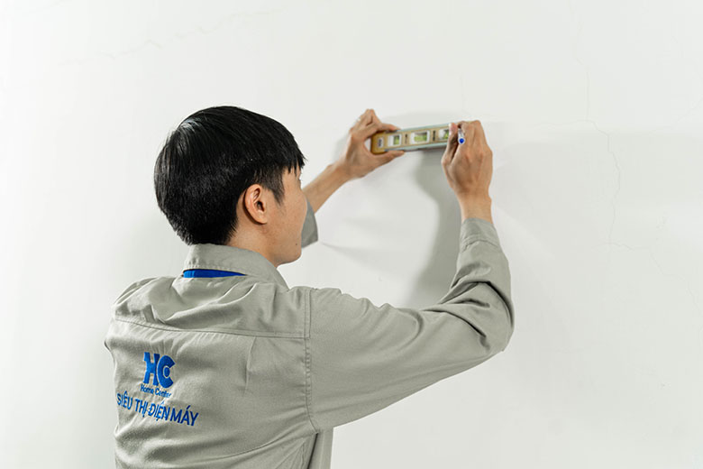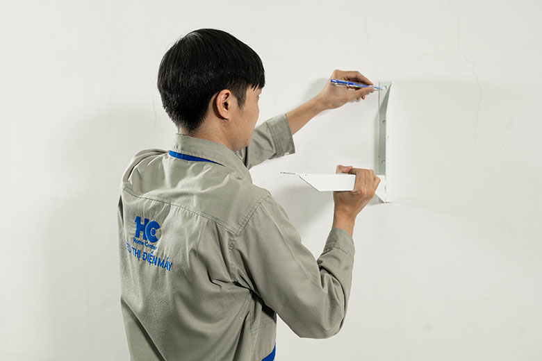Dùng thước căn vị trí giá đỡ đỡ sao cho khi lắp lên dàn lạnh ở vị trí cân bằng.