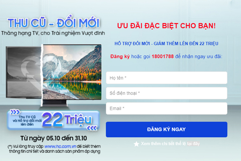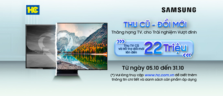 3. Nội dung chương trình: Trong thời gian diễn ra chương trình, khi khách hàng thay sản phẩm tivi bất kỳ đã qua sử dụng để đổi sang mua tivi thương hiệu Samsung mới tại Siêu thị Điện máy HC sẽ được hỗ trợ đổi mới lên đến 22 triệu (Xem danh sách sản phẩm áp dụng tại đây).