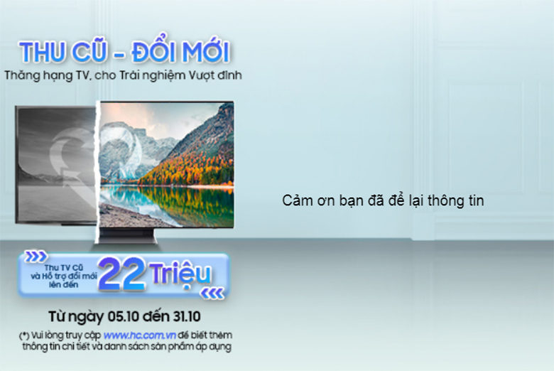 Nhanh tay tham gia ngay để không bỏ lỡ cơ hội lên đời “siêu phẩm” tivi Samsung cơ hội chỉ có trong tháng 9 này. Nếu Quý khách hàng còn bất kỳ thắc mắc nào về chương trình "Thu TV cũ - Lên đời TV mới - Cho trải nghiệm vượt đỉnh" xin vui lòng liên hệ Hotline: 18001788 (miễn phí) để được tư vấn và hỗ trợ nhanh nhất nhé!