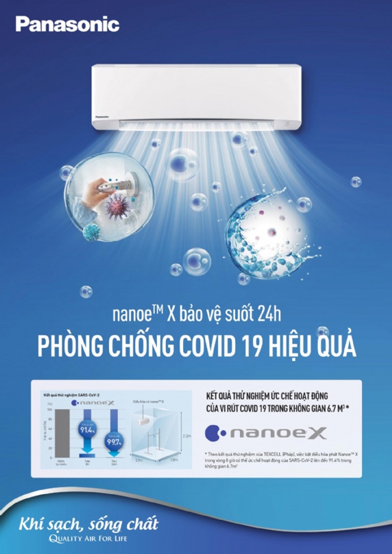 Công ty Panasonic Việt Nam công bố, Tổ chức Nghiên cứu Tiếp xúc Toàn Cầu Texcell*1 đã xác minh khả năng ức chế vi rút SARS-CoV-2 của điều hòa Panasonic trang bị công nghệ nanoe™ X. Theo đó, Texcell*1 xác minh việc bật điều hòa được trang bị nanoe™ X trong vòng 8 giờ có thể ức chế 91,4% hoạt động của SARS-CoV-2 trong không gian 6,7m3.