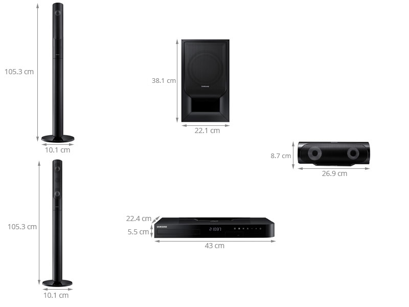 Kích thước loa sub (loa bass)Cao 38.1 cm - Ngang 22.1 cm - Sâu 36.5 cm