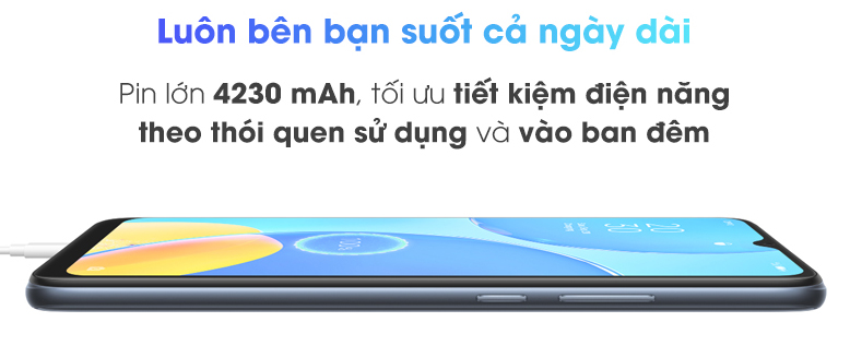 Oppo A15 sở hữu viên pin lớn với dung lượng 4230 mAh cho phép bạn sử dụng suốt cả ngày dài, đáp ứng tốt các hoạt động học tập, giải trí, xem video… Kết hợp với công nghệ tiết kiệm pin cho bạn sử dụng được lâu hơn và củ sạc 10 W giúp sạc nhanh hơn để bạn không phải tốn quá nhiều thời gian cho việc nạp đầy năng lượng điện thoại.
