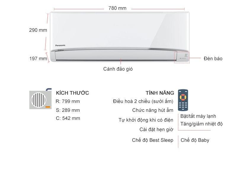 Tiện íchCó sưởi ấm (điều hòa 2 chiều), Tự khởi động lại khi có điện, Hẹn giờ bật tắt máy, Chức năng hút ẩm, Có tự điều chỉnh nhiệt độ (chế độ ngủ đêm), Hoạt động siêu êm, Thổi gió dễ chịu (cho trẻ em, người già)