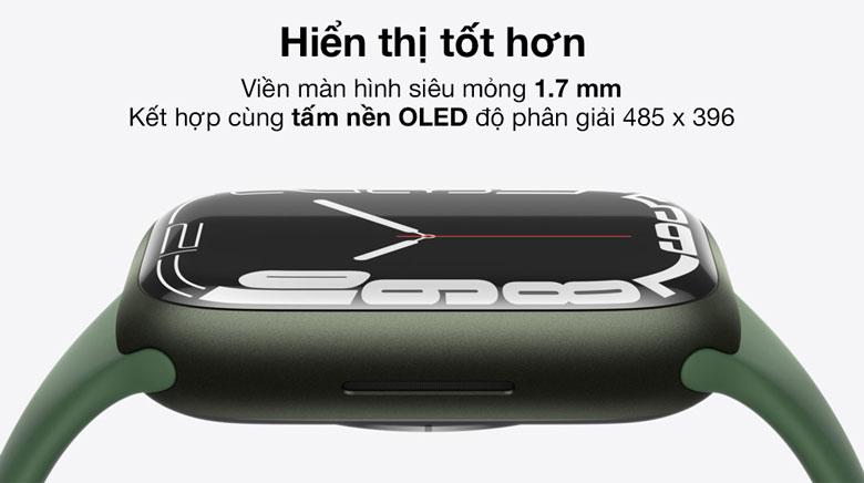 Mặt đồng hồ trẻ trung, hình vuông bo tròn 4 góc, màn hình viền mỏng tuyệt đẹp mang đến một thiết kế năng động, thanh lịch. Apple Watch Series 7 được trang bị màn hình OLED 1.77 inch có độ phân giải 485 x 396 pixels cho khả năng hiển thị hình ảnh sắc nét, sống động, màu sắc trung thực.