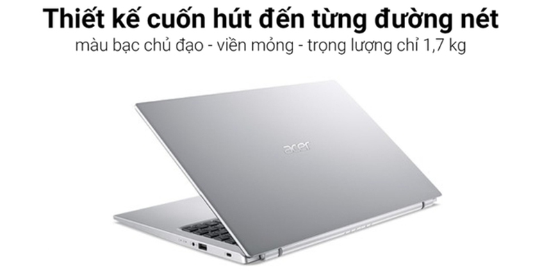 Laptop Acer Aspire 3 A315-58G-50S4 sở hữu thiết kế tinh tế, năng động với kiểu dáng đơn giản, gọn nhẹ, màu bạc sang trọng thu hút bạn ngay từ cái nhìn đầu tiên. Máy có thiết kế viền 2 bên mỏng đẹp trang nhã cho trải nghiệm xem tốt hơn đồng thời giúp laptop gọn gàng hơn. Acer Aspire 3 A315-58G-50S4 có độ dày chỉ khoảng 19.9 mm và trọng lượng khoảng 1.7 kg khá mỏng nhẹ thuận tiện để bạn cho vào balo mang theo đi học hay đi làm hàng ngày.