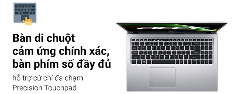 Laptop Acer có bàn phím Fullsize, hành trình phím ổn định, độ sâu hợp lý giúp bạn gõ phím êm ái, chính xác hơn. Hàng phím số bên phải thuận tiện cho việc tính toán, nhập liệu của dân văn phòng.