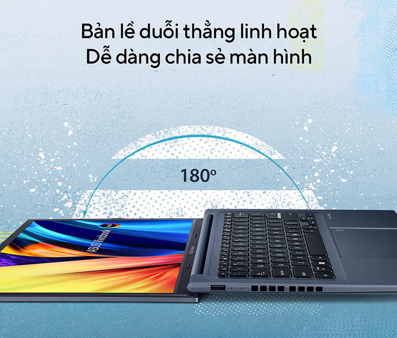 Tỏa sáng bằng phong cách của bạn với ASUS Vivobook 15X OLED, màu sắc hiện đại và thiết kế hình học thanh lịch. Phiên bản Vivobook A1503ZA-L1421W màu Bạc sẽ thể hiện phong cách trẻ trung nhưng đầy sang trọng, lịch lãm của bạn. Máy mỏng tới mức bạn có thể dễ dàng xếp vào ba lô và nhẹ tới mức có thể dễ dàng cầm bằng một tay. Bản lề mở 180° giúp bạn dễ dàng chia sẻ màn hình với mọi người xung quanh.