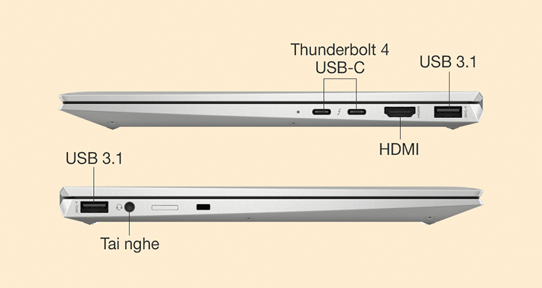 HP EliteBook X360 1030 G8 3G1C5PA trang bị các cổng kết nối tiện lợi như USB 3.1, HDMI, Headphone/Microphone combo audio jack và đặc biệt 2 cổng Thunderbolt 4 USB-C vừa sạc vừa kết nối nhanh chóng với các thiết bị tương thích khác. Theo đó, bạn có thể dễ dàng kết nối máy tính với các thiết bị ngoại vi, hỗ trợ tối đa nhu cầu học tập, làm việc và giải trí hàng ngày.