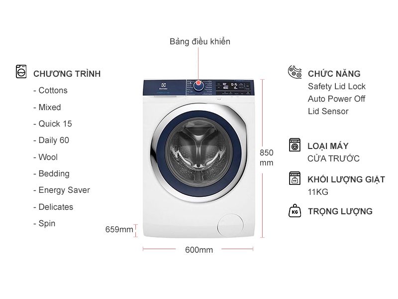 Máy giặt Electrolux 11 kg đáp ứng nhu cầu giặt giũ hàng ngày cho gia đình đông người, trên 6 thành viên.