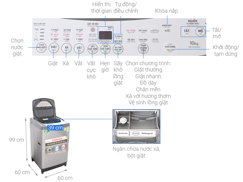 Máy giặt Toshiba AW-H1100GV(SM) có khối lượng giặt là 10 kg, phù hợp cho các gia đình có trên 6 thành viên. Khối lượng giặt lớn này cho phép máy có thể giặt được cả chăn màn đồng thời Toshiba cũng đã trang bị chương trình giặt dành riêng cho chăn màn ngay trên bảng điều khiển giúp người sử dụng không cần phải tự thiết lập.