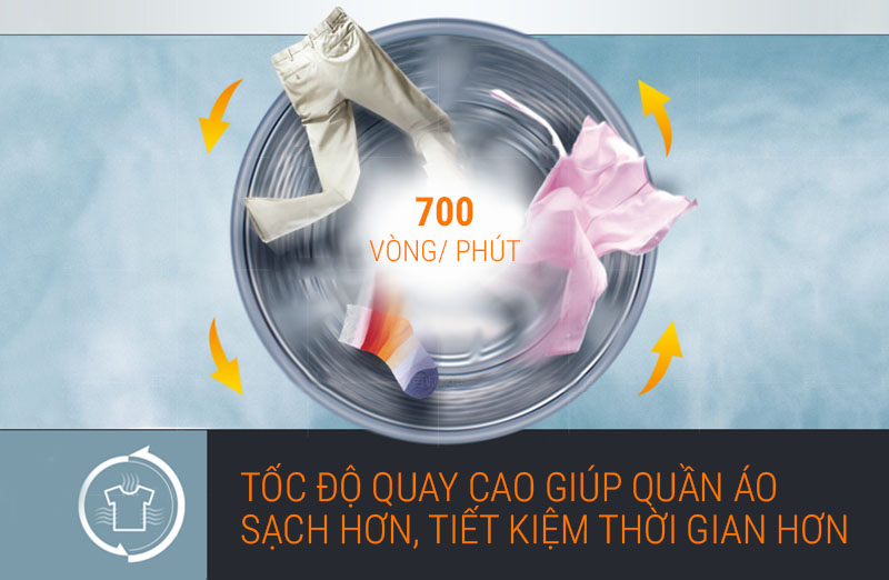 Tiết kiệm thời gian Chức năng vắt khô với 700 vòng/phút và chế độ vắt cực khô kết hợp với hệ thống khe hút khí vòng cung ở phía trên của nắp máy giặt tạo nên luồng khí thổi cực mạnh trong quá trình vắt, giúp rút ngắn thời gian phơi và giúp bảo vệ các sợi vải không bị sờn rối, giúp quần áo bền lâu hơn.