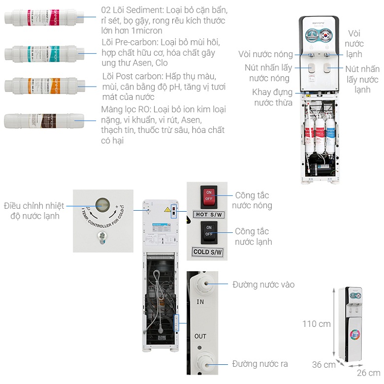 Korihome WPK-838 có 2 công tắc nóng lạnh riêng biệt, có thể linh hoạt tắt hoặc bật các chế độ nóng lạnh tùy nhu cầu sử dụng hoặc theo mùa trong năm. Theo đó, sẽ giúp tiết kiệm tối đa điện năng sử dụng, tăng công suất lọc cho vòi nước sử dụng chủ yếu để cung cấp nước sạch hàng ngày cho gia đình.