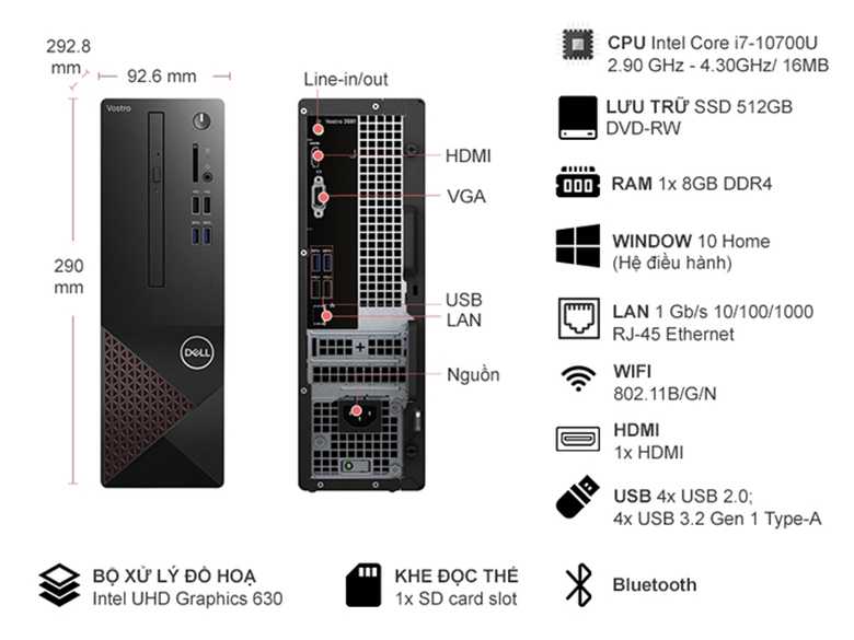 Máy tính để bàn Dell Vostro trang bị nhiều cổng kết nối như: USB 3.2, USB 2.0, Audio combo, LAN, VGA, HDMI… giúp bạn dễ dàng kết nối máy tính với các thiết bị như màn hình, chuột, bàn phím, tai nghe đáp ứng tối ưu nhu cầu học tập, giải trí.