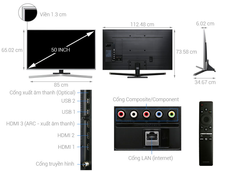 Tivi Samsung 50RU7400 hỗ trợ nhiều cổng kết nối như: HDMI, USB, AV, Wifi,… giúp bạn dễ dàng kết nối, chia sẻ và thưởng thức những nội dung giải trí yêu thích từ các thiết bị khác trên màn hình lớn của chiếc Smart tivi.
