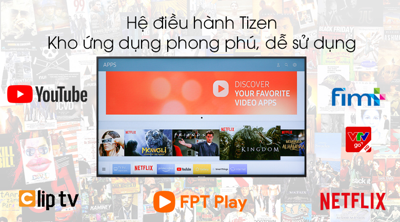 Hệ điều hành Tizen OS trên Smart tivi Samsung có giao diện trực quan, dễ sử dụng cùng nhiều ứng dụng giải trí hấp dẫn như: YouTube, Netflix, FPT Play, Fim+,... Theo đó, bạn có thể thoải mái nghe nhạc, xem phim, lướt web, đọc tin tức… trên chính chiếc tivi của gia đình.