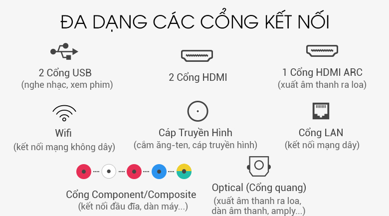 Tivi Samsung 55RU7200 hỗ trợ nhiều cổng kết nối như: HDMI, Optical, USB... giúp bạn dễ dàng chia sẻ và thưởng thức những nội dung giải trí yêu thích từ các thiết bị khác trên màn hình lớn của tivi.