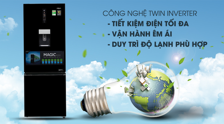 Công nghệ Twin Inverter giúp tốc độ chạy của quạt và máy nén thay đổi theo nhu cầu hoạt động của tủ. Theo đó, tủ lạnh hoạt động hiệu quả, tiết kiệm điện năng hơn. Cùng với đó, tủ lạnh Aqua Inverter mang đến khả năng vận hành vô cùng êm ái, bền bỉ.