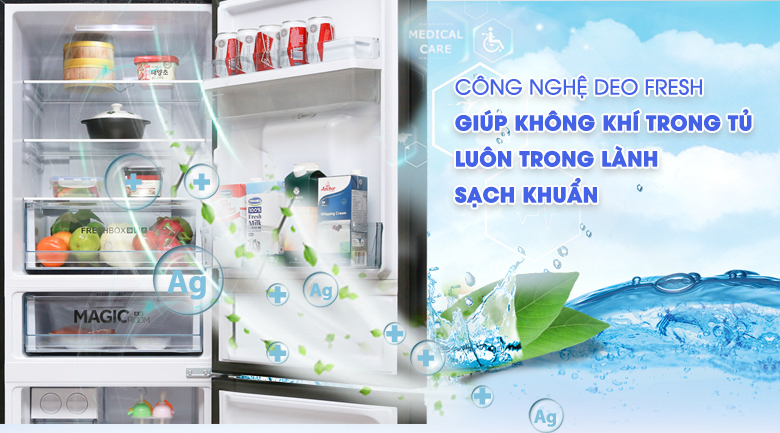 Tủ lạnh Aqua Inverter AQR-IW338EB (BS) tích hợp công nghệ DEO Fresh với ion bạc Ag+ giúp kháng khuẩn, khử mùi cho không gian trong tủ luôn sạch thoáng, không bị bám mùi khó chịu, không ảnh hưởng đến hương vị của thực phẩm hay các món ăn.