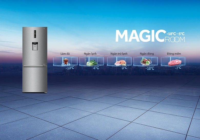 Với ngăn tùy chỉnh nhiệt độ Magic Room, bạn có thể tùy chỉnh thay đổi nhiệt độ ngăn từ -18 đến 5 độ C chuyển đổi thành ngăn đông, ngăn lạnh hoặc ngăn đông mềm đáp ứng nhu cầu sử dụng đa dạng, bảo quản phong phú các loại thực phẩm của mỗi gia đình.