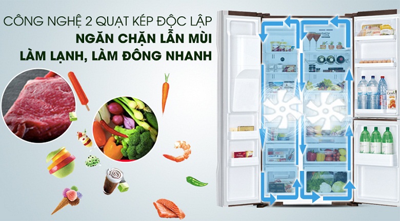 Tủ lạnh Hitachi Inverter R-FM800AGPGV4X(DIA) tích hợp hệ thống quạt kép, cung cấp khí lạnh riêng biệt cho ngăn đá và ngăn lạnh đảm bảo hiệu quả bảo quản tốt nhất cho mỗi loại thực phẩm khác nhau và tránh lẫn mùi. Luồng khí lạnh được tỏa đều đến nhiều vị trí trong tủ giúp thực phẩm luôn tươi ngon và giữ được hàm lượng dinh dưỡng cao.