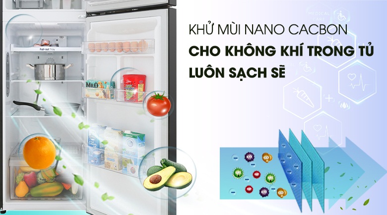 Tủ lạnh tích hợp công nghệ khử mùi Nano Cacbon, giúp loại bỏ vi khuẩn và mùi khó chịu giữ cho thực phẩm bảo quản bên trong luôn tươi ngon, trọn vị.