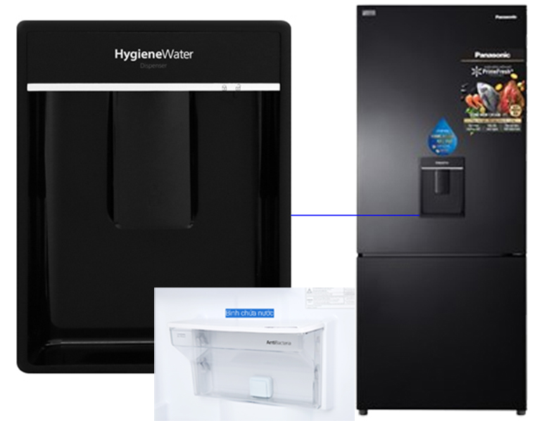 Bạn có thể thưởng thức ly nước mát lạnh từ ngăn lấy nước ngoài với bình chứa dung tích 3 lít mà không cần mở cửa tủ, hạn chế thất thoát nhiệt, tiết kiệm điện năng. Nước được duy trì độ tinh khiết nhờ bình chứa nước khép kín, được đúc bằng nhựa kháng khuẩn, đồng thời có chức năng khử mùi với bộ lọc carbon bên trong.