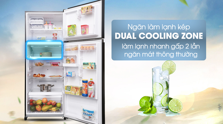 Với nước uống lạnh và thức ăn cần ướp lạnh. Tủ lạnh được trang bị ngăn làm lạnh kép Dual Cooling Zone của tủ lạnh Toshiba. Với luồng khí lạnh thoát ra từ 2 ngõ, ngăn làm lạnh kép này nhanh chóng làm lạnh thực phẩm và nước uống của bạn chỉ trong chớp mắt.