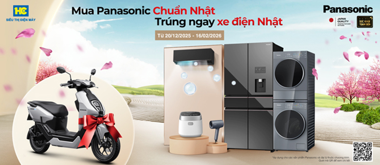 Trong thời gian từ 20/12/2025 đến hết ngày 16/02/2026, Khách hàng mua sản phẩm Tủ lạnh, máy giặt, máy sấy, tủ chăm sóc quần áo, điều hoà, gia dụng thương hiệu Panasonic đang bày bán tại hệ thống Siêu thị Điện máy HC sẽ được tham gia chương trình bốc thăm may mắn “MUA PANASONIC CHUẨN NHẬT, TRÚNG NGAY XE ĐIỆN NHẬT”.